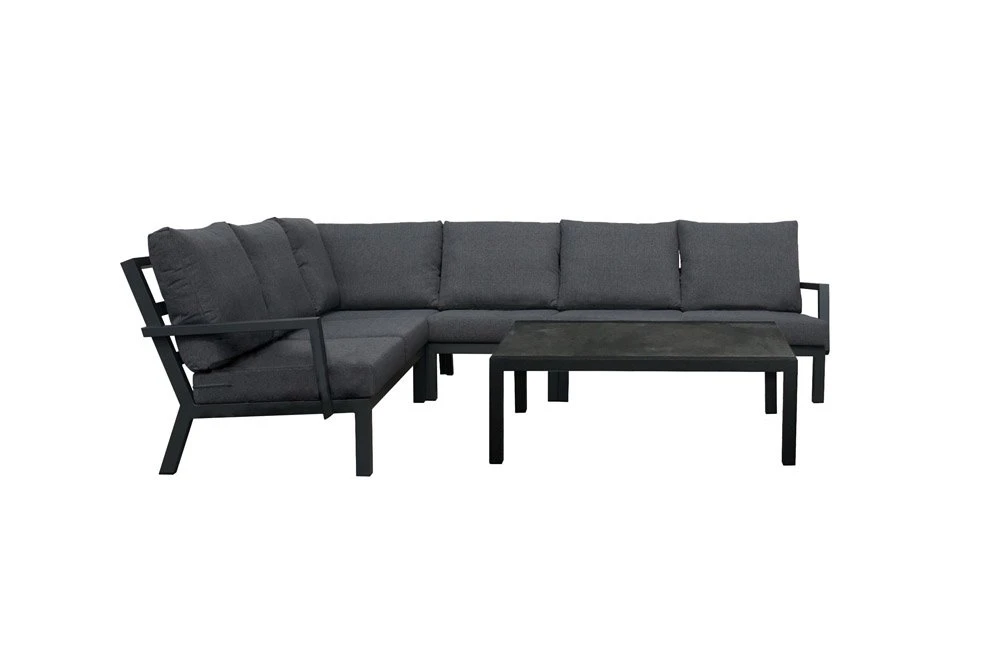 De COSTA RICA hoekbank heeft een antraciet aluminium frame. Hierdoor is deze set licht in gewicht en bovendien erg sterk. Daarom wordt aluminium veel gebruikt in de productie van tuinmeubelen. De SOL salontafel is voorzien van een keramisch tafelblad. Deze tuinset wordt inclusief grijze kussens geleverd.